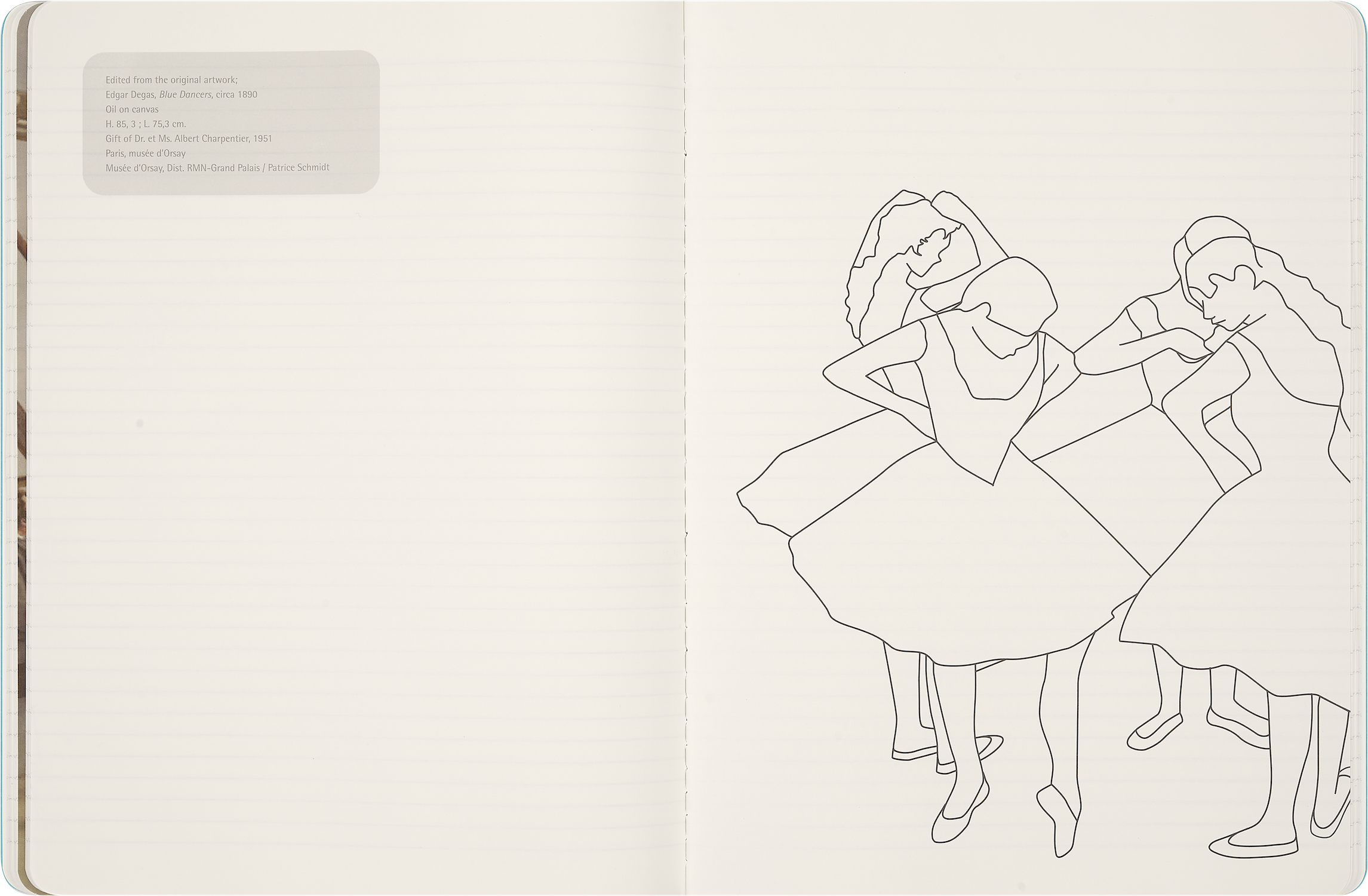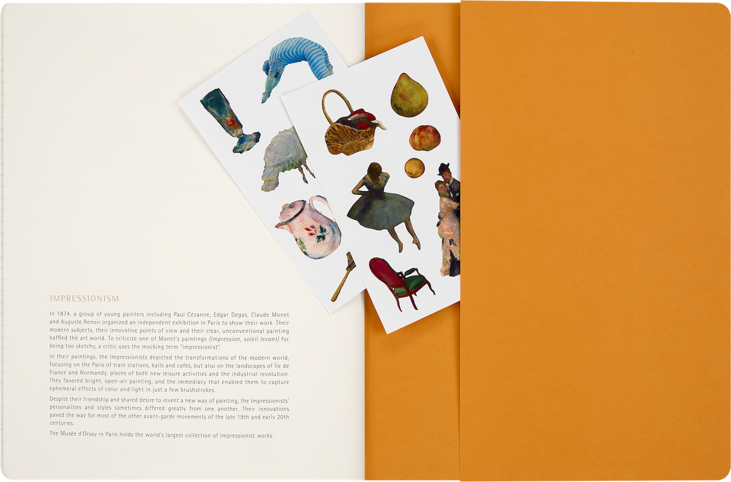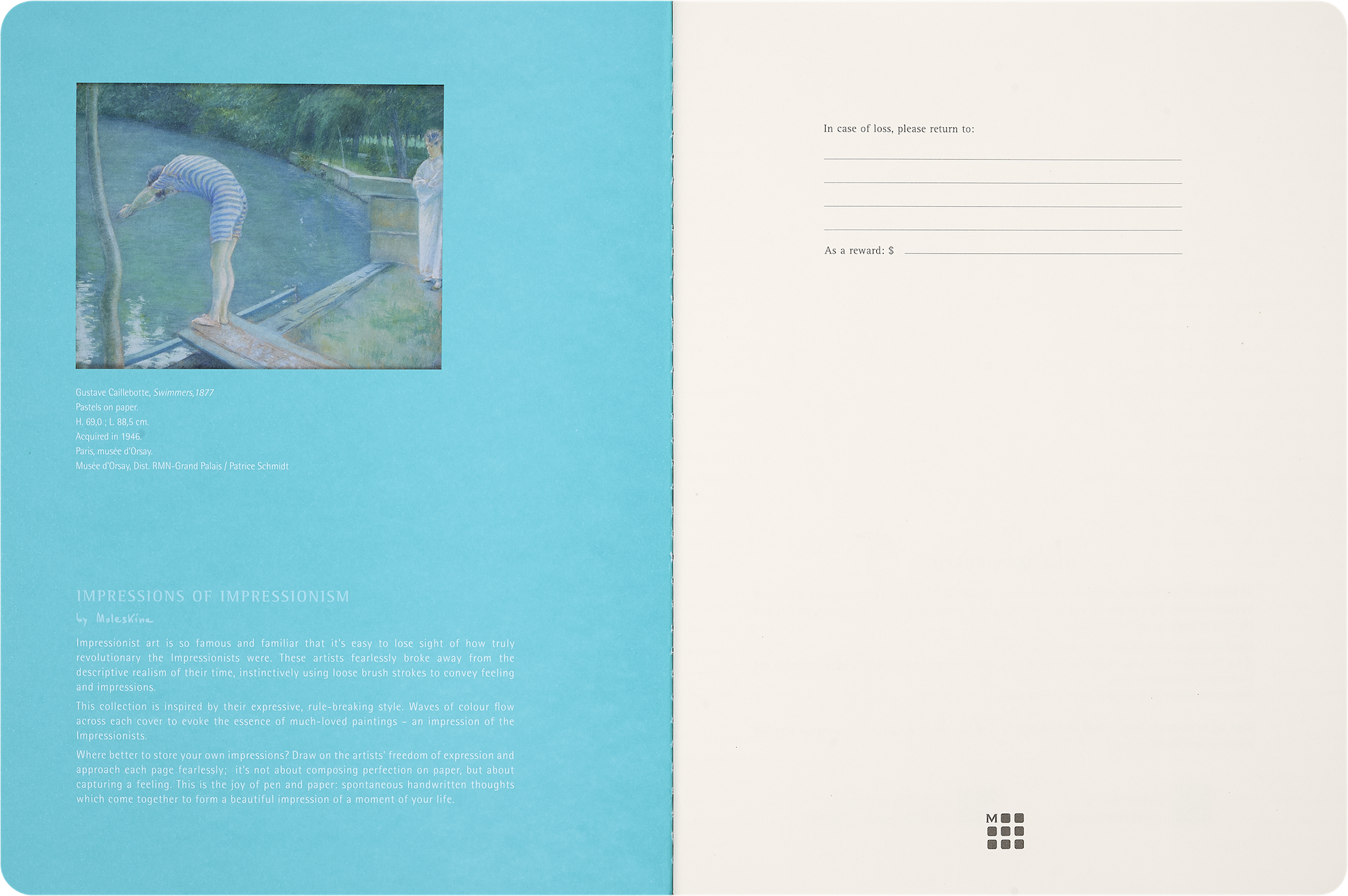 Колекція Moleskine Impressionism надихається їхнім зухвалим духом і вмінням порушувати правила. Хвилі кольору розтікаються обкладинками кожного записника, пропонуючи свіже прочитання вічних шедеврів — враження від імпресіоністів. Цей записник Cahier створений як простір для збирання думок, дослідження ідей та джерел натхнення. Дизайн обкладинки натхненний роботою Le Nageur Гюстава Кайботта, відтворюючи дух картини через гру кольору й форми — це своєрідне відображення враження, яке залишає цей улюблений твір. У комплект також входять тематичні наліпки та розмальовки.