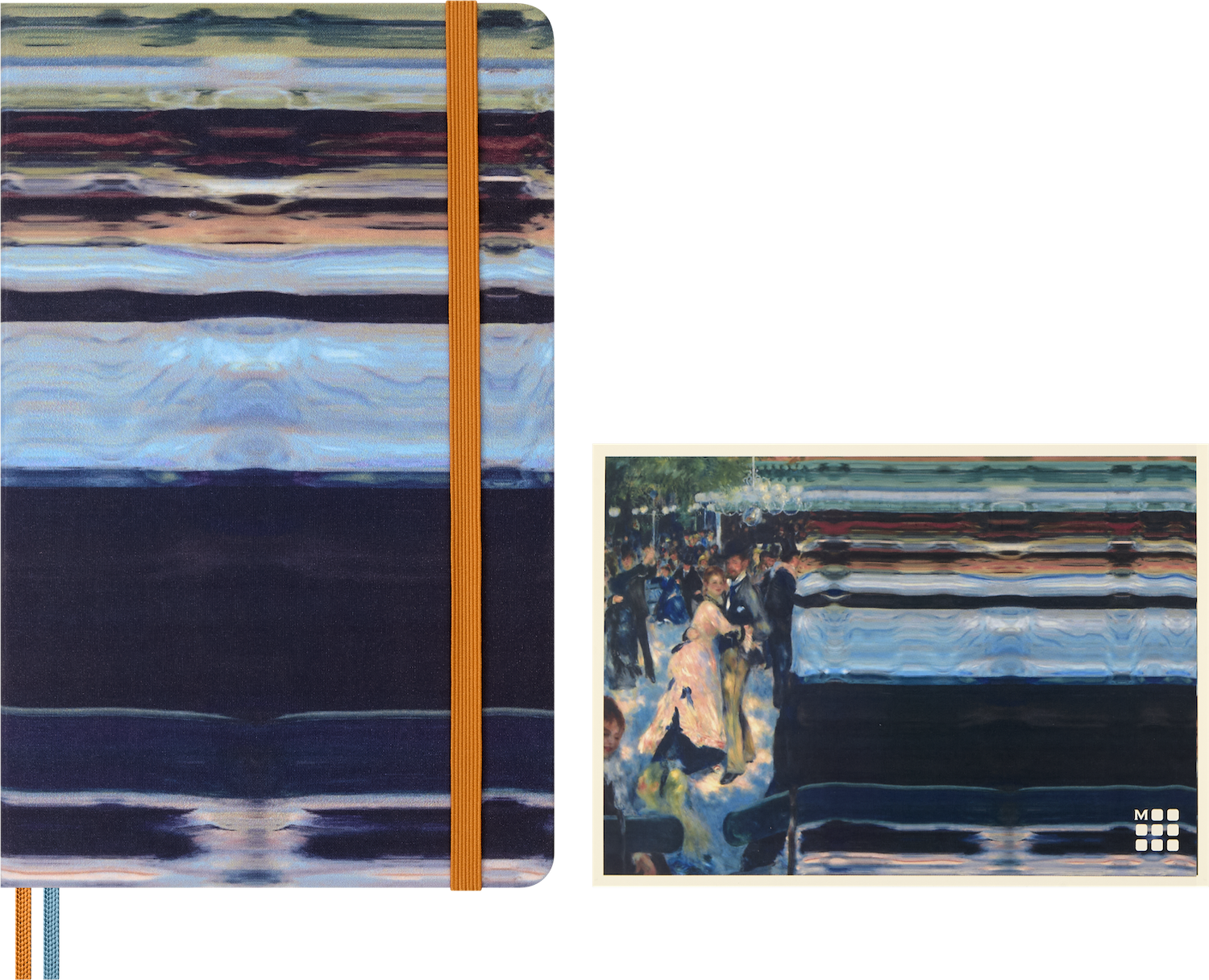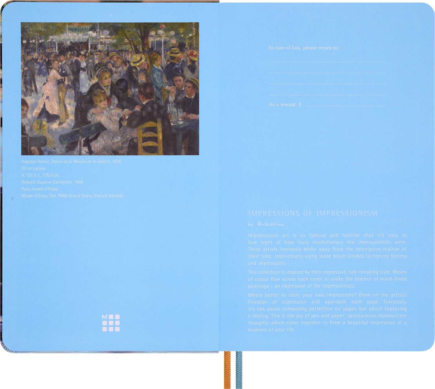 Колекція Moleskine Impressionism надихається їхнім зухвалим духом і вмінням порушувати правила. Хвилі кольору розтікаються обкладинками кожного записника, пропонуючи свіже прочитання вічних шедеврів — враження від імпресіоністів. Цей записник Cahier створений як простір для збирання думок, дослідження ідей та джерел натхнення. Дизайн обкладинки натхненний роботою Le Nageur Гюстава Кайботта, відтворюючи дух картини через гру кольору й форми — це своєрідне відображення враження, яке залишає цей улюблений твір. У комплект також входять тематичні наліпки та розмальовки.
